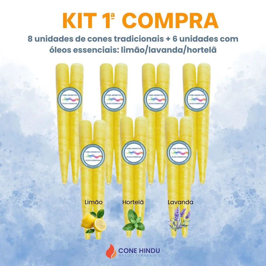 Kit com 8 unidades de cone hindu tradicional + 4 unidades de cone hindu com óleo essencial de lavanda, + 4 unidades de cone hindu com óleo essencial de hortelã.